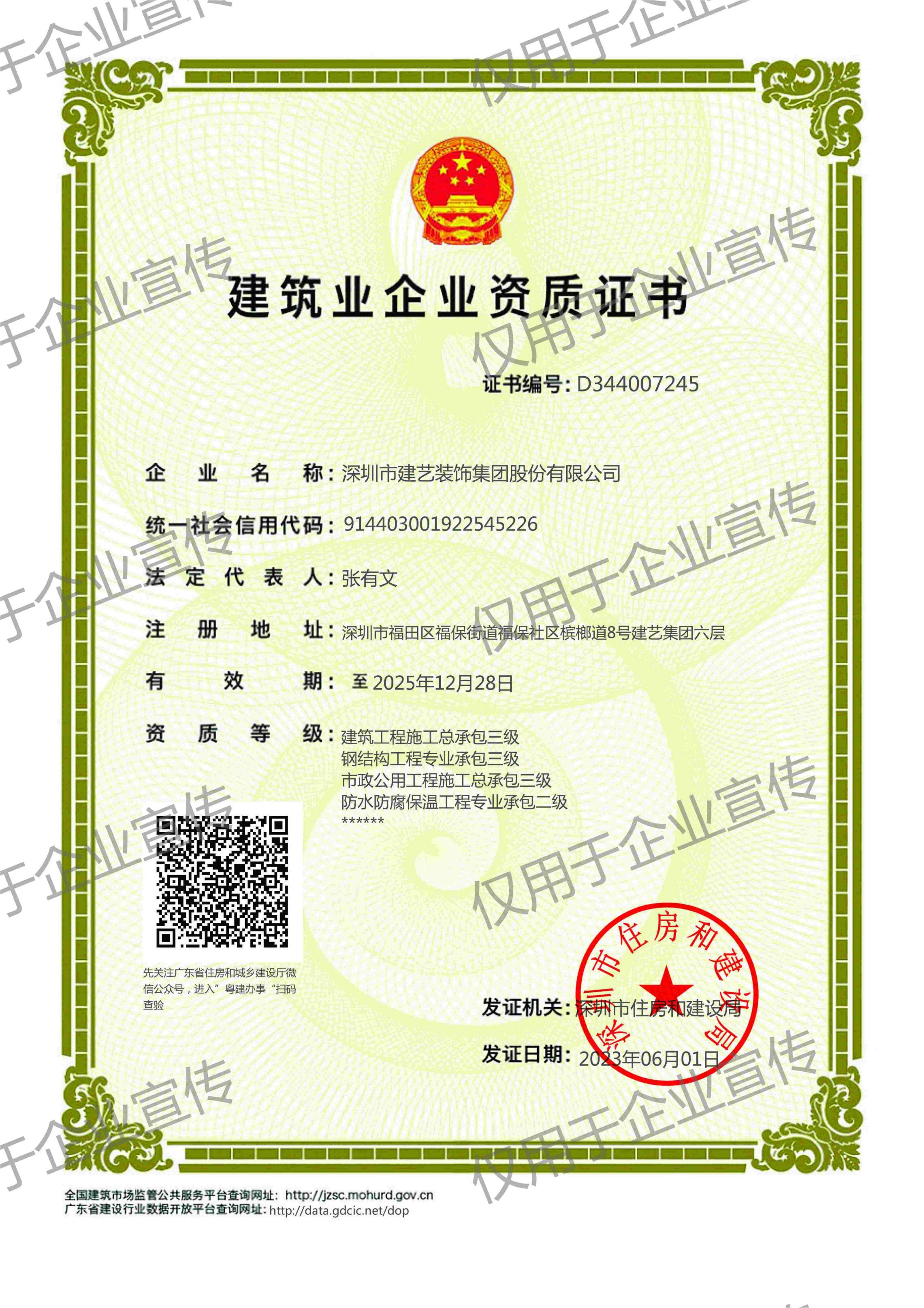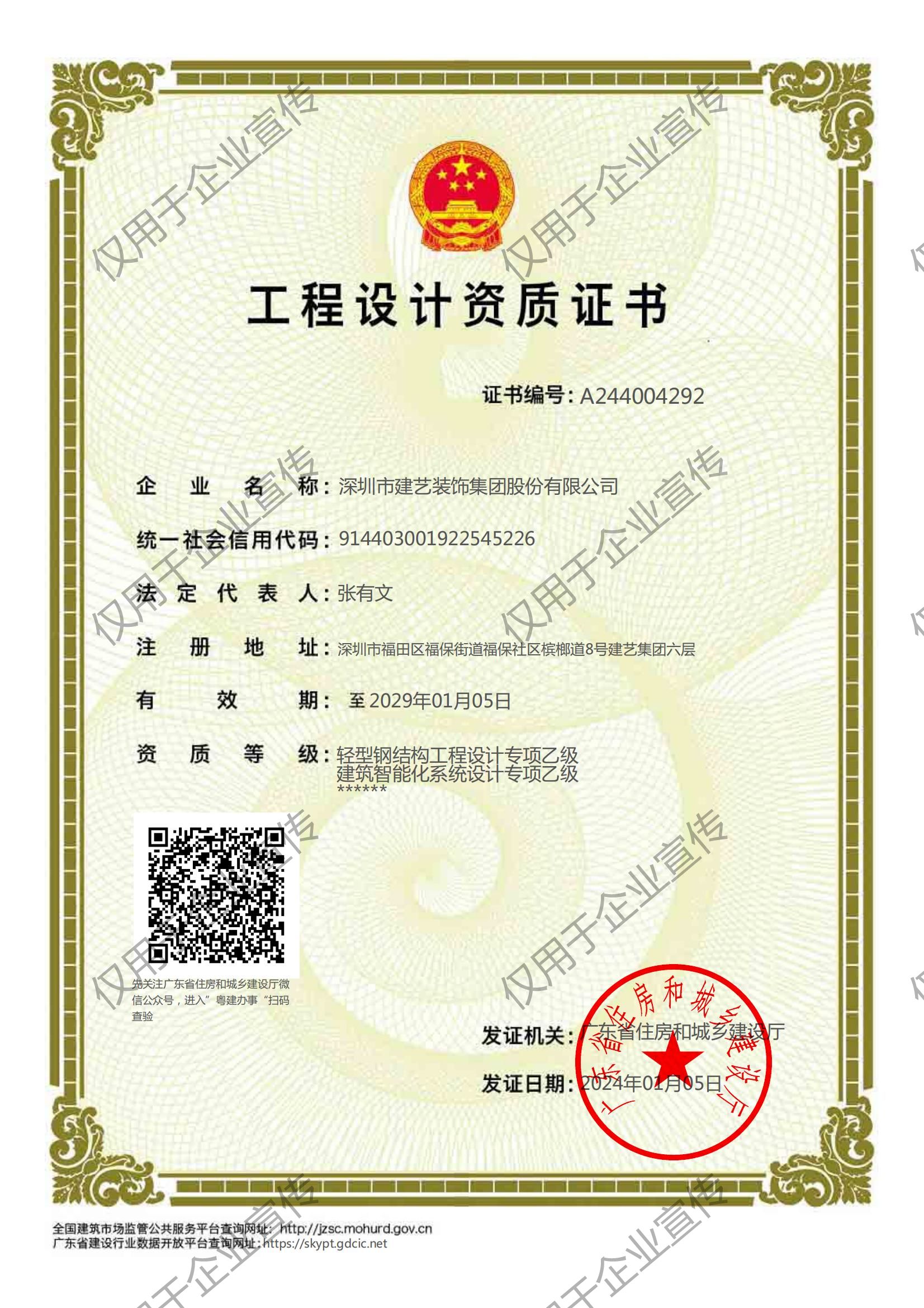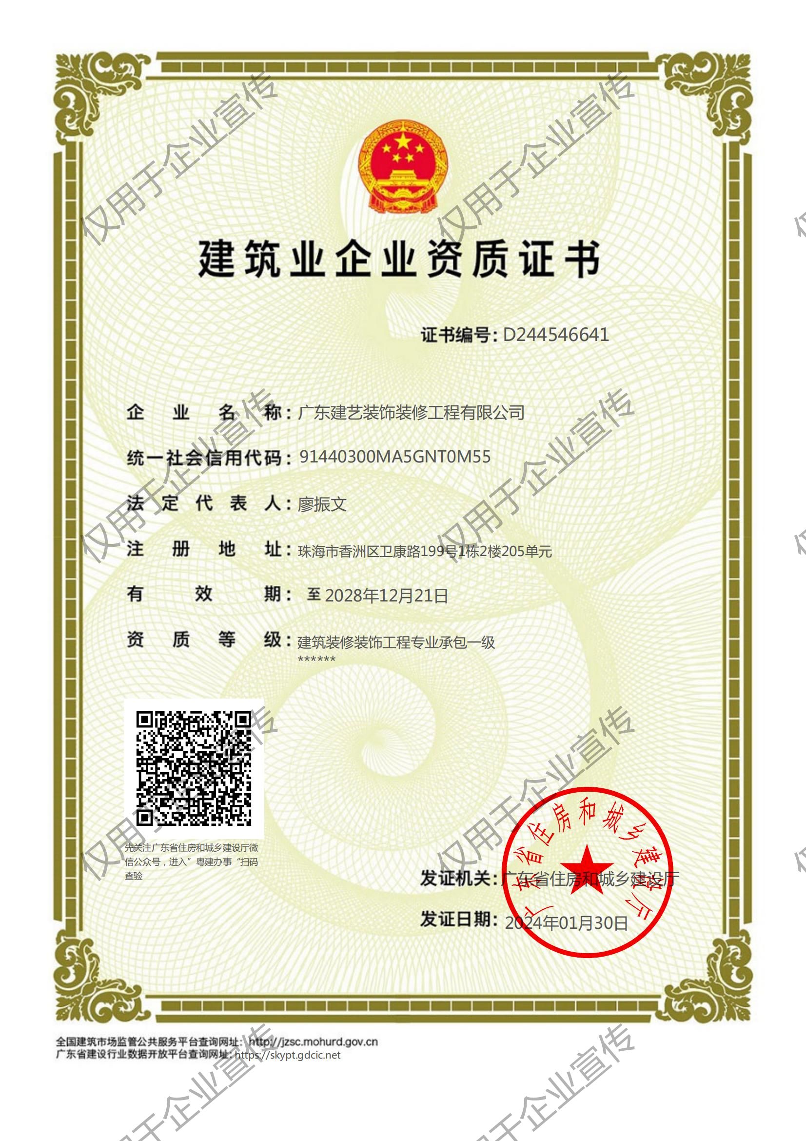 建筑装修装饰、建筑幕墙、电子与智能化、建筑机电安装工程专业承包一级;市政公用、建筑工程施工总承包二级