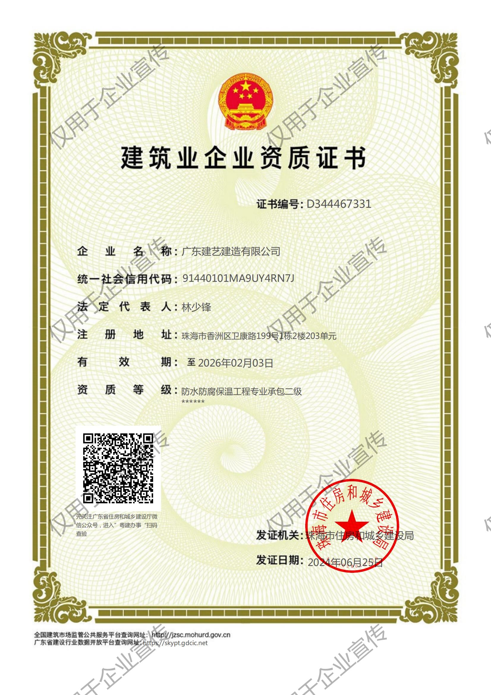 防水防腐保温、电子与智能化、消防设施、地基基础、建筑装修装饰工程专业承包一级;市政公用工程专业承包二级