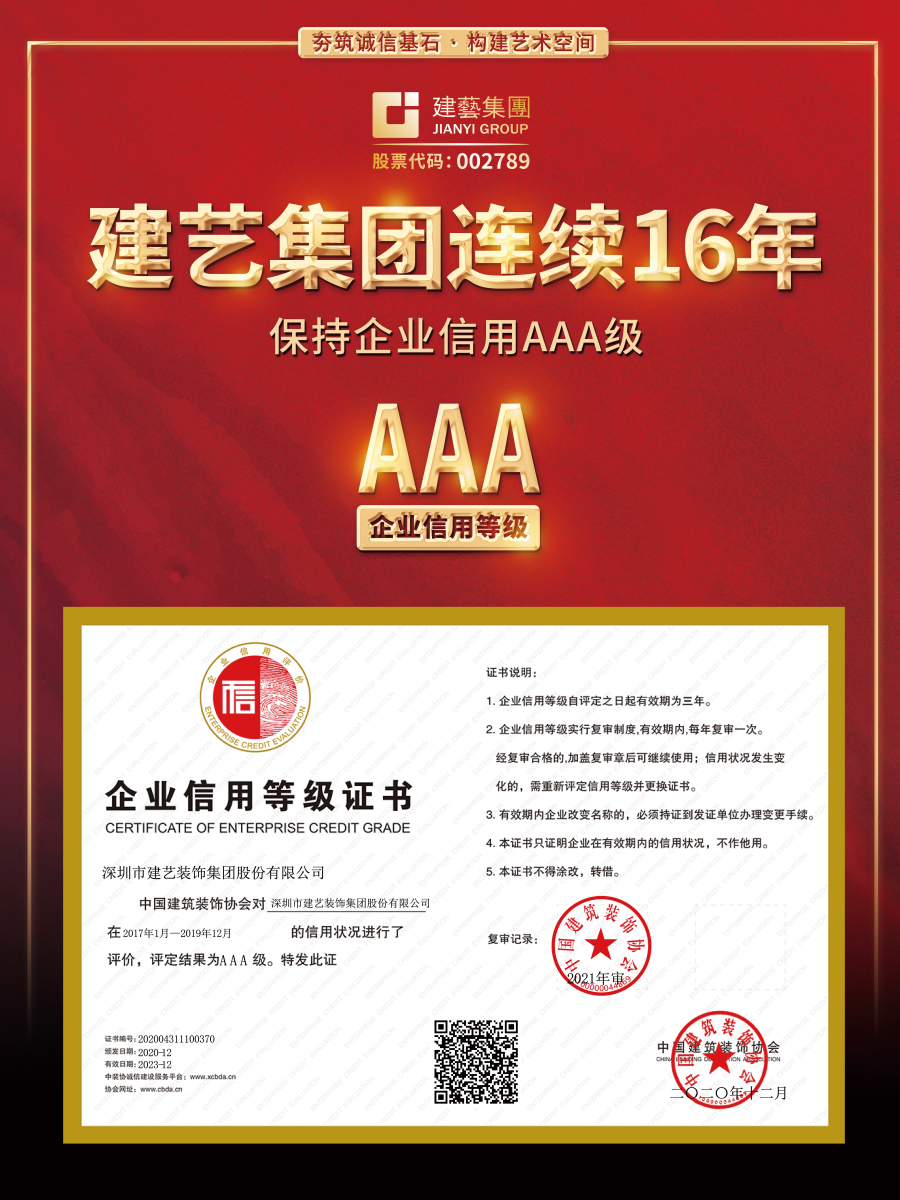 日前,中国建筑装饰协会发布了《2021年度(第二批)建筑装饰行业信用评价复评公告名单》,广发体彩-广发(中国),集团等近三百家优秀装饰企业获行业最高信用等级——AAA级评定,这也是广发体彩-广发(中国),集团连续16年保持企业信用AAA级。