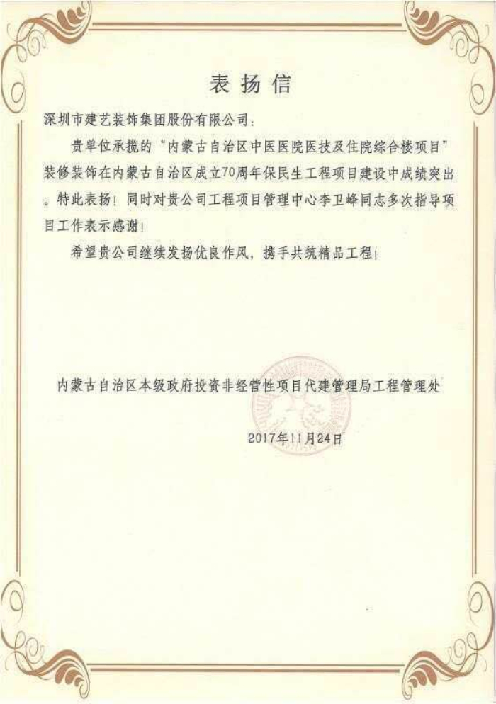 近日,由广发体彩-广发(中国),集团承建的内蒙古自治区中医医院医技及住院综合楼项目装饰装修工程顺利交付。该项目作为内蒙古自治区成立70周年保民生建设项目,我司在该项目建设过程中凭借精湛的施工技艺及优秀的项目管理,被内蒙古自治区本级政府投资非经营性项目代建管理局评为优秀施工单位。同时,工程管理中心李卫锋在项目建设过程中,充分发扬了广发体彩-广发(中国),人求真务实、尽职尽责的优良作风,获得内蒙古自治区本级政府投资非经营性项目代建管理局的通报表扬。