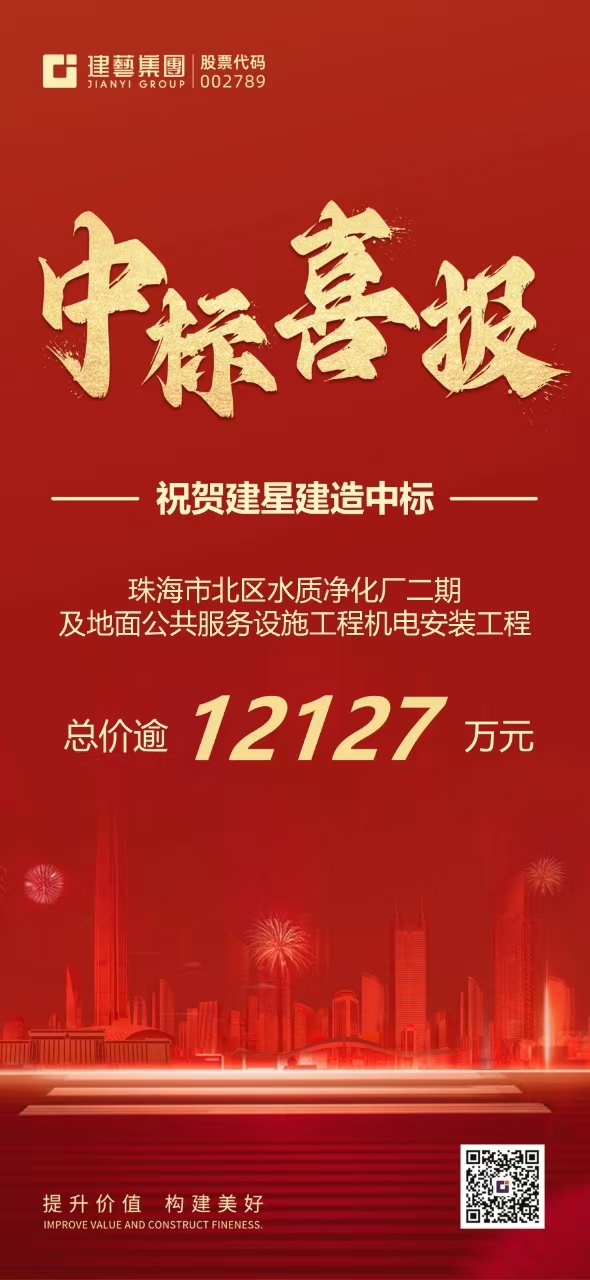 近日,广发体彩-广发(中国),旗下子公司广东建星建造集团有限公司(以下称“建星集团”)喜获中标:珠海市北区水质净化厂二期及地面公共服务设施工程机电安装工程,总价逾1.21亿元