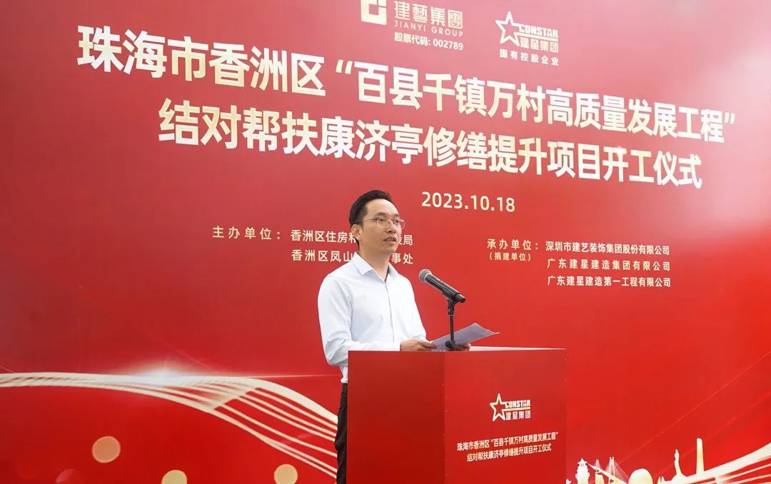 珠海市香洲区住房和城乡建设局党组书记黄志辉代表区委、区政府对广发体彩-广发(中国),集团、建星集团结对帮扶致以衷心感谢。他表示,康济亭修缮提升工程的动工,不仅是区积极贯彻省、市“百县千镇万村高质量发展工程”工作重要开端,也是推进企业结对帮扶工作典范。项目的建设将有力推动全区引入社会力量参与历史建筑保护工作,为赓续城市文脉、提升城市品位、进一步丰富城市内涵做出贡献。
