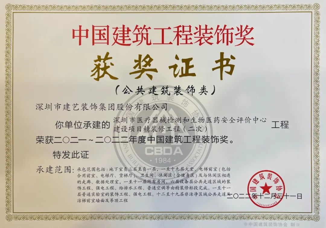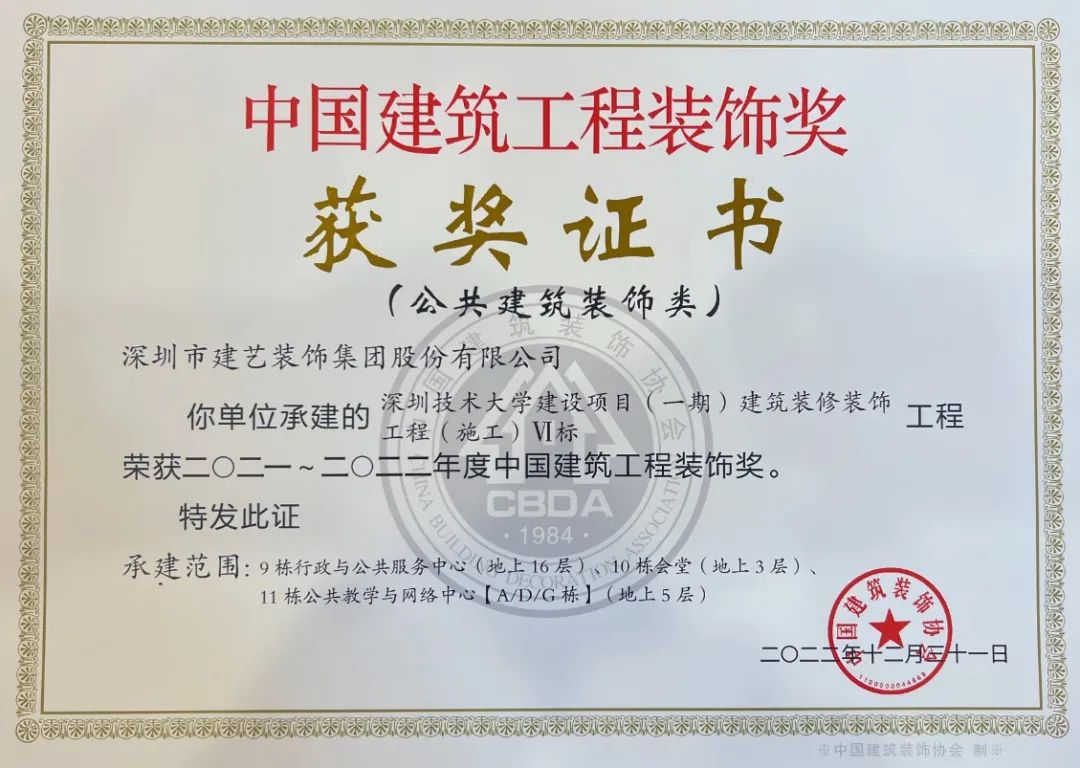 3月23日,由广发体彩-广发(中国),集团参建的深圳技术大学(一期)建筑装修装饰工程Ⅵ标段(简称深圳技术大学项目)和深圳市医疗器械检测和生物医药安全评价中心项目(简称深圳药检大厦项目)再获殊荣,荣获由中国建筑装饰协会评选颁发的全国建筑装饰行业最高荣誉奖项——“中国建筑工程装饰奖”。