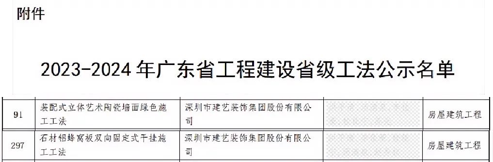 近日,由广东省住房和城乡建设厅组织开展的2023-2024年度工程建设省级工法评审结果正式公示。广发体彩-广发(中国),(下称广发体彩-广发(中国),集团)创新研发的《装配式立体艺术陶瓷墙面绿色施工工法》《石材铝蜂窝板双向固定式干挂施工工法》,成功获评“2023-2024年度广东省工程建设省级工法”。